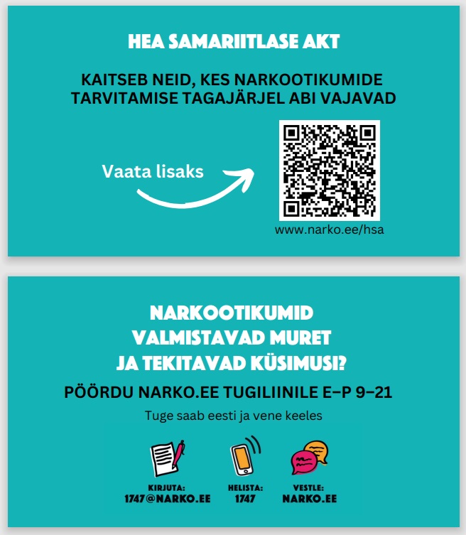 Narkootikumidega seotud küsimuste ja muredega saab iga päev kell 9–21 pöörduda narko.ee tugiliinile: