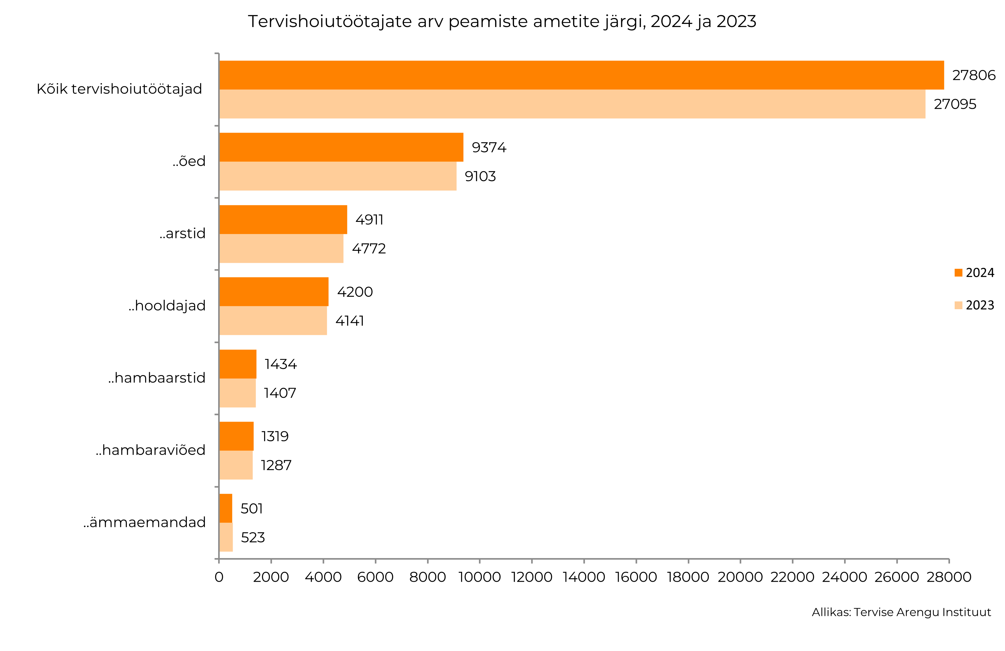 Tervise Arengu Instituudi (TAI) andmebaasis avaldati Eesti tervishoiutöötajate 2024. aasta andmed. 2024. aasta novembri seisuga oli Eestis kokku 27 806 tervishoiutöötajat ja -spetsialisti, keda on 3% rohkem kui 2023. aastal.